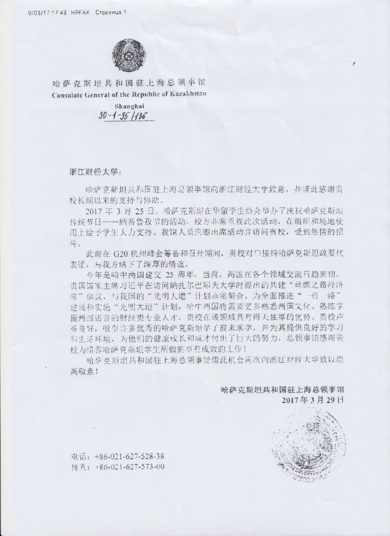 3月29日,哈萨克斯坦驻上海总领事馆致信我校,对我校在克拉把叶夫·佐齐汉总领事访问杭州,慰问在华哈萨克斯坦留学生以及哈萨克斯坦留学生协会举办那吾热孜节期间所给予的大力帮助,表示赞扬和感谢。