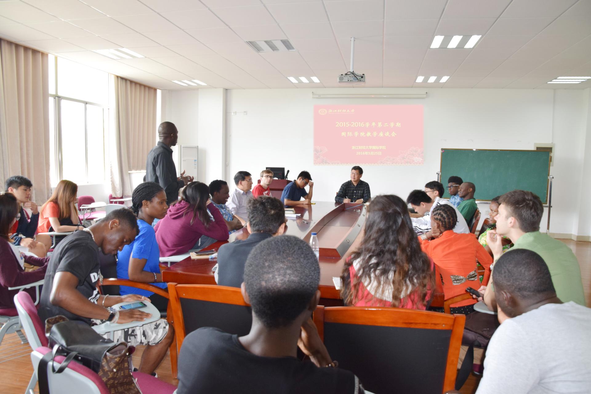 近日,402cc永利组织留学生代表和相关教师在105会议室召开了2015-2016学年第二学期教学座谈会。此次会议由管春林副院长主持,会议主要围绕课堂教学展开,与会的留学生和教师代表畅所欲言,就教学方法、授课语言、教学排课、教学评价等情况进行了交流反馈,并提出了意见和建议。