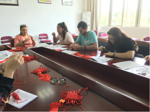 介绍完中国结的历史后,黄老师分发了三种中国结的制作手册和工具,并向留学生现场示范了其中吉祥结的制作方法。有的留学生学得比较快,八宝结、蜻蜓结很快也出现在制作台上,并且还添加上了他们自己的创新编法。上手快的同学帮助有困难的同学一起完成中国结制作,拉近了同学之间的距离。看着自己的最终制作成果,同学们非常开心。