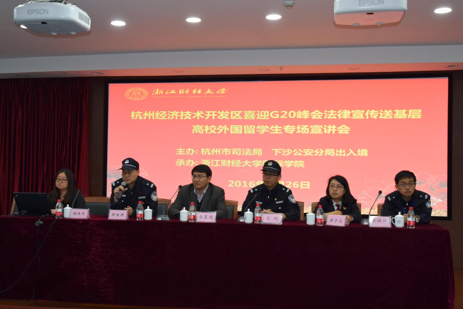 4月26日,为帮助外国留学生了解我国的法律法规,提高他们的法律意识,增强他们的法制观念,以保证G20峰会期间我校外籍人员的安全稳定,来自杭州市公安局经济技术开发区公安分局出入境管理大队、杭州市经济技术开发区司法局和白杨派出所的警官联合为我校留学生带来了“喜迎G20--留学生法制宣传”讲座。