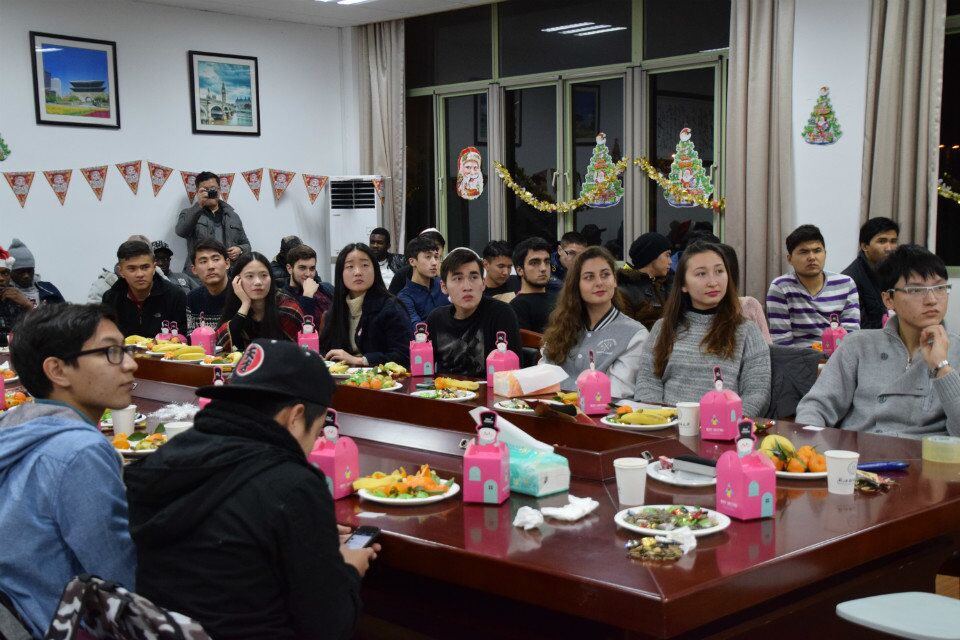 学院为留学生准备了小吃,水果和咖啡,大家围坐在一起,相互交流,相互问候,相互祝福。伴随着温馨的气氛,来自世界各地的学生上台表演了有各自民族特色的小节目,中间还穿插着一些趣味小游戏和抽奖活动,将现场气氛一次又一次推向高潮。同学们载歌载舞,现场气氛一片融洽。