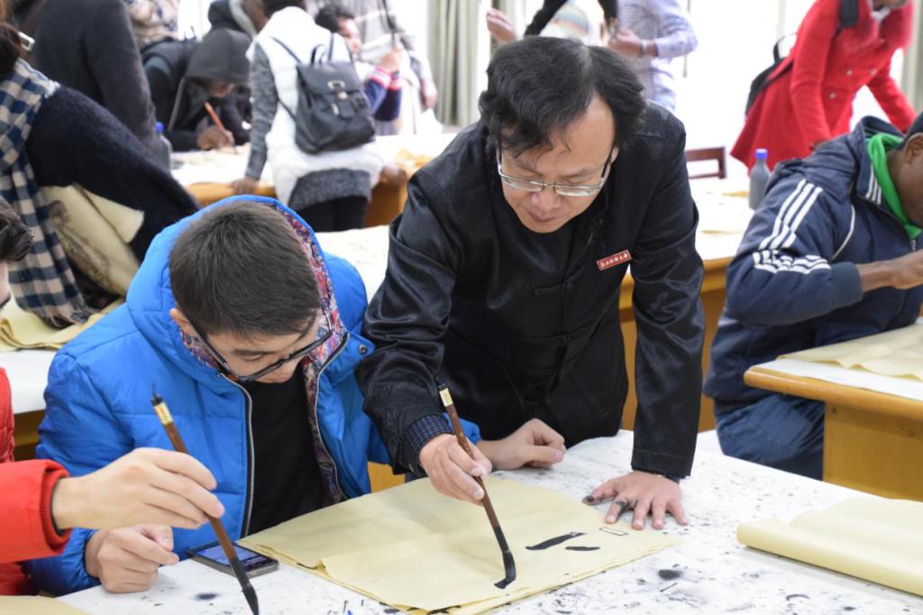 留学生们对于中国书法艺术表现出极大的兴趣,认真聆听黄校长的讲解,并积极踊跃地参与实践,学习用毛笔字来书写汉字,在笔墨纸砚中、在浓浓的墨香中体会中国传统书法艺术的独特魅力。黄校长还亲自指导学生如何书写、如何用笔,部分留学生在实践中找到了书法的乐趣,在一笔一划中体会到了中国书法的美,并表示会继续学习、练习中国书法。