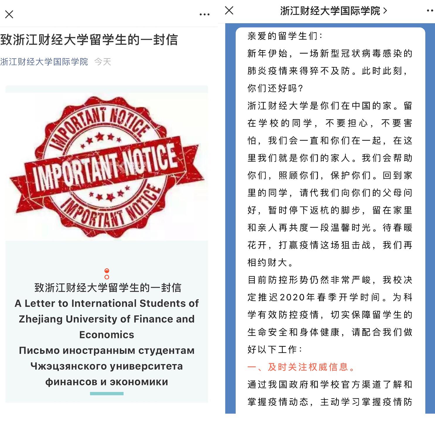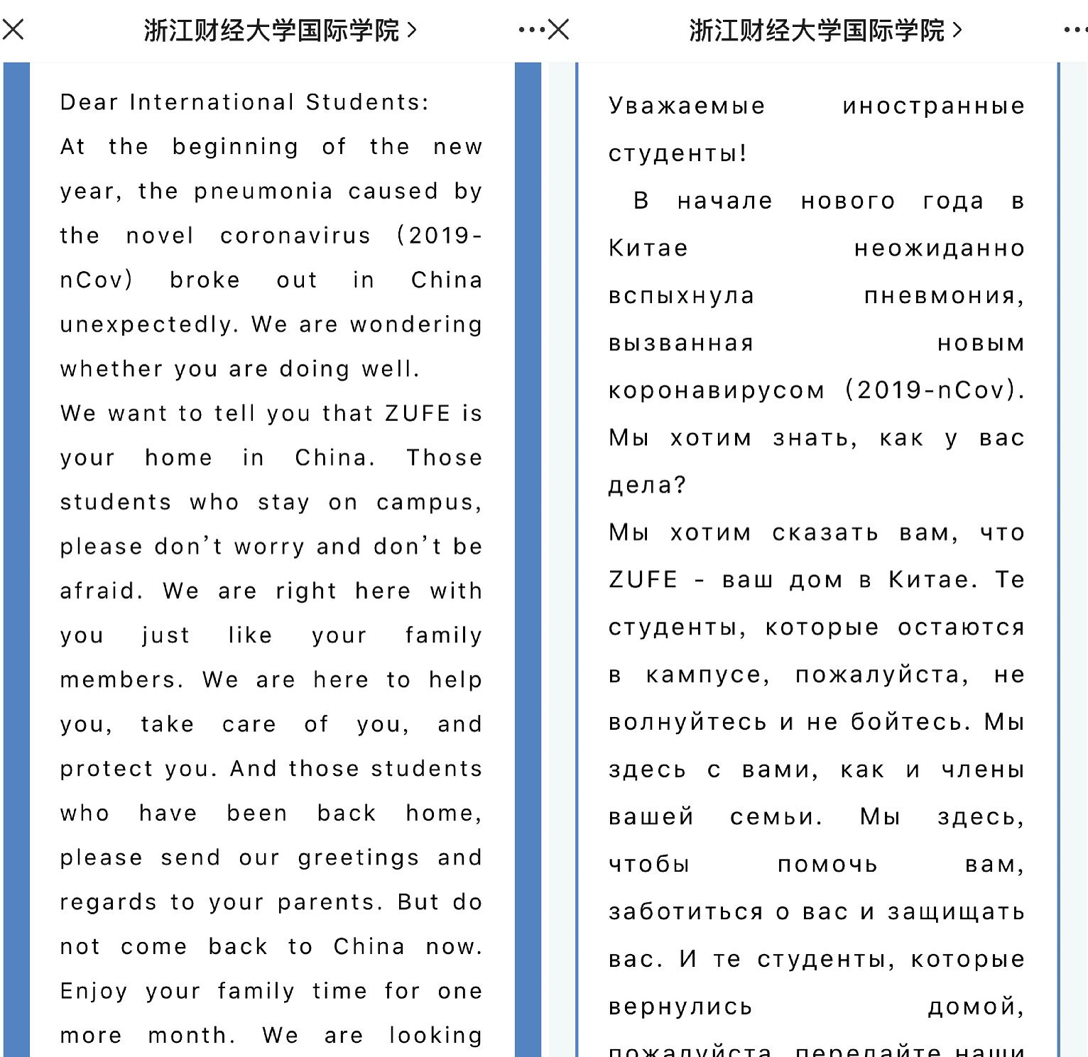 近日,402cc永利给留学生们写了一封热情温暖的长信,为了让每位学生都清楚了解新冠肺炎疫情动态及学校近期工作安排,老师们准备了中英俄3种语言。此时此刻,学校的关心和关爱牵动着每一位留学生的心,在财大,老师们就是留学生的家人。