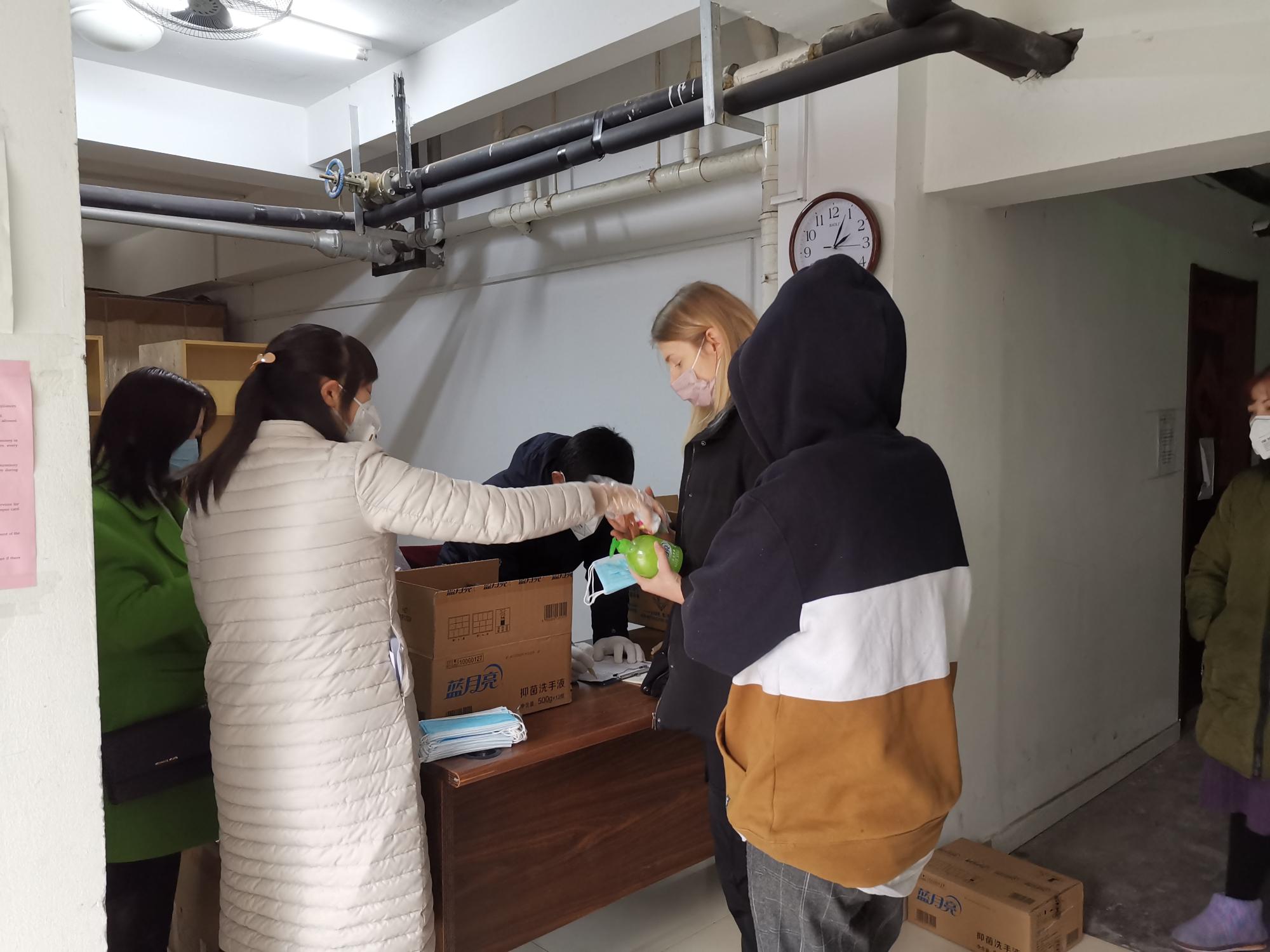 张莲、任夫元、黄小玲老师在留学生宿舍发放物资 |