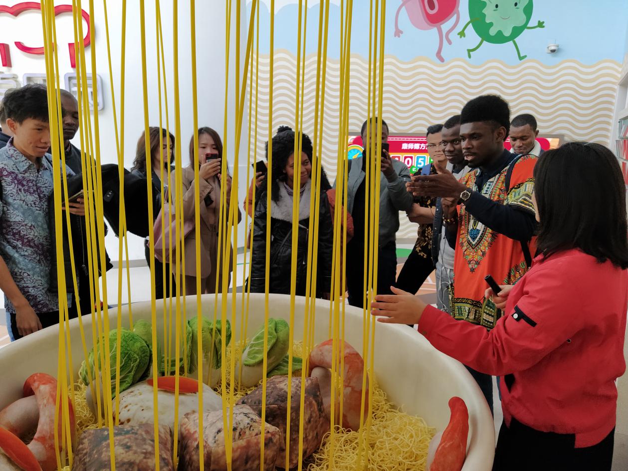 跟随着讲解人员的脚步,留学生们首先来到红烧牛肉面的立体模型前,巨大的碗里放着牛肉、青菜、虾、鸡蛋等食材模型,大碗的上方有一个叉子,叉子上挂着金黄色的面条。旁边是一幅由各种食材填充的中国地图,不同食材代表我国不同地域的口味偏好,也代表着康师傅因地制宜所推出的各种特色口味,红烧排骨、鲜虾鱼板、老坛酸菜等等,口味之多让留学生们连连称奇。