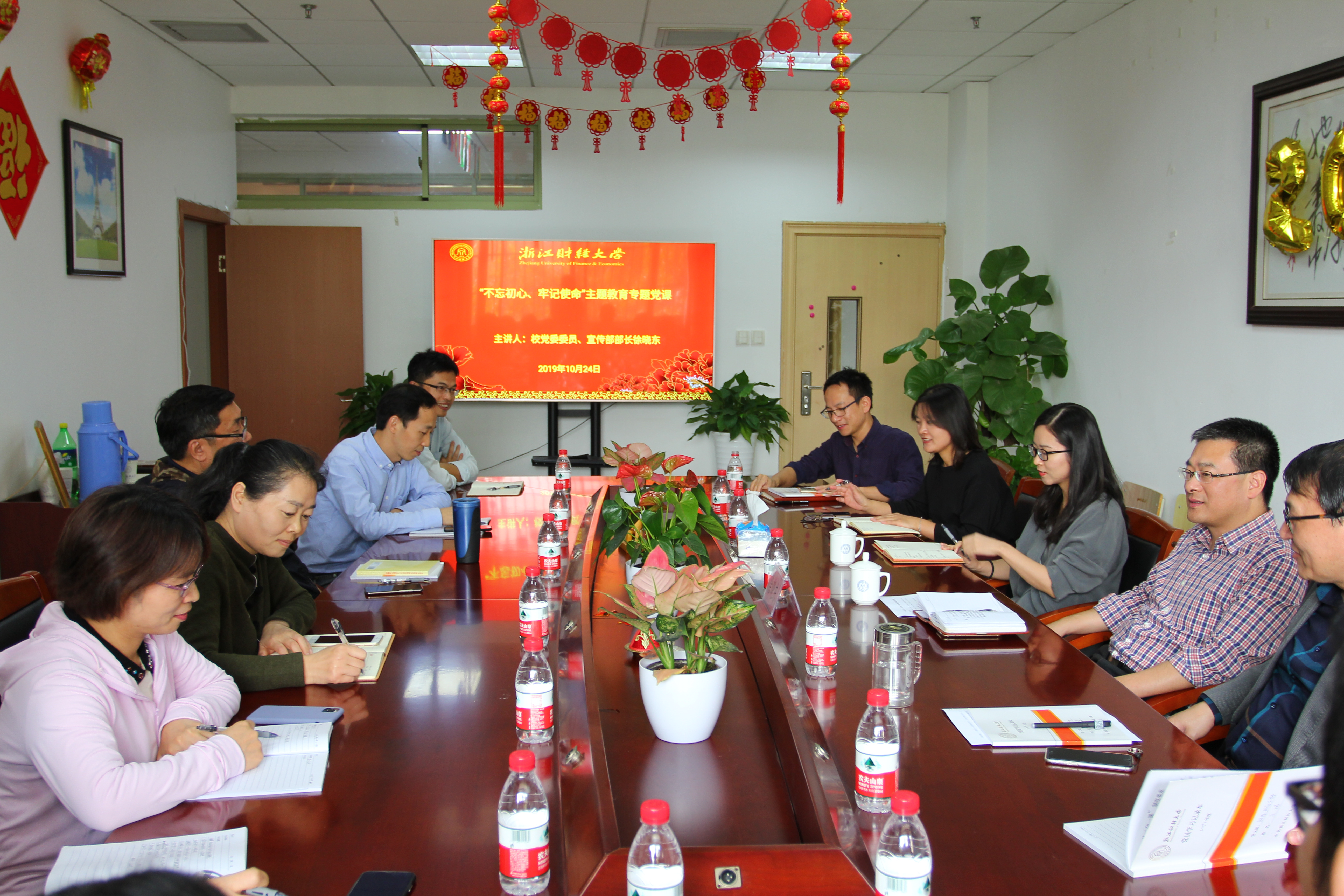 10月24日,校党委委员、宣传部部长徐晓东来到402cc永利,给国际处402cc永利联合党支部党员上了一堂生动的“不忘初心、牢记使命”主题党课。参加党课的还有资产管理处、采购中心、信息化办公室等部门的党员。