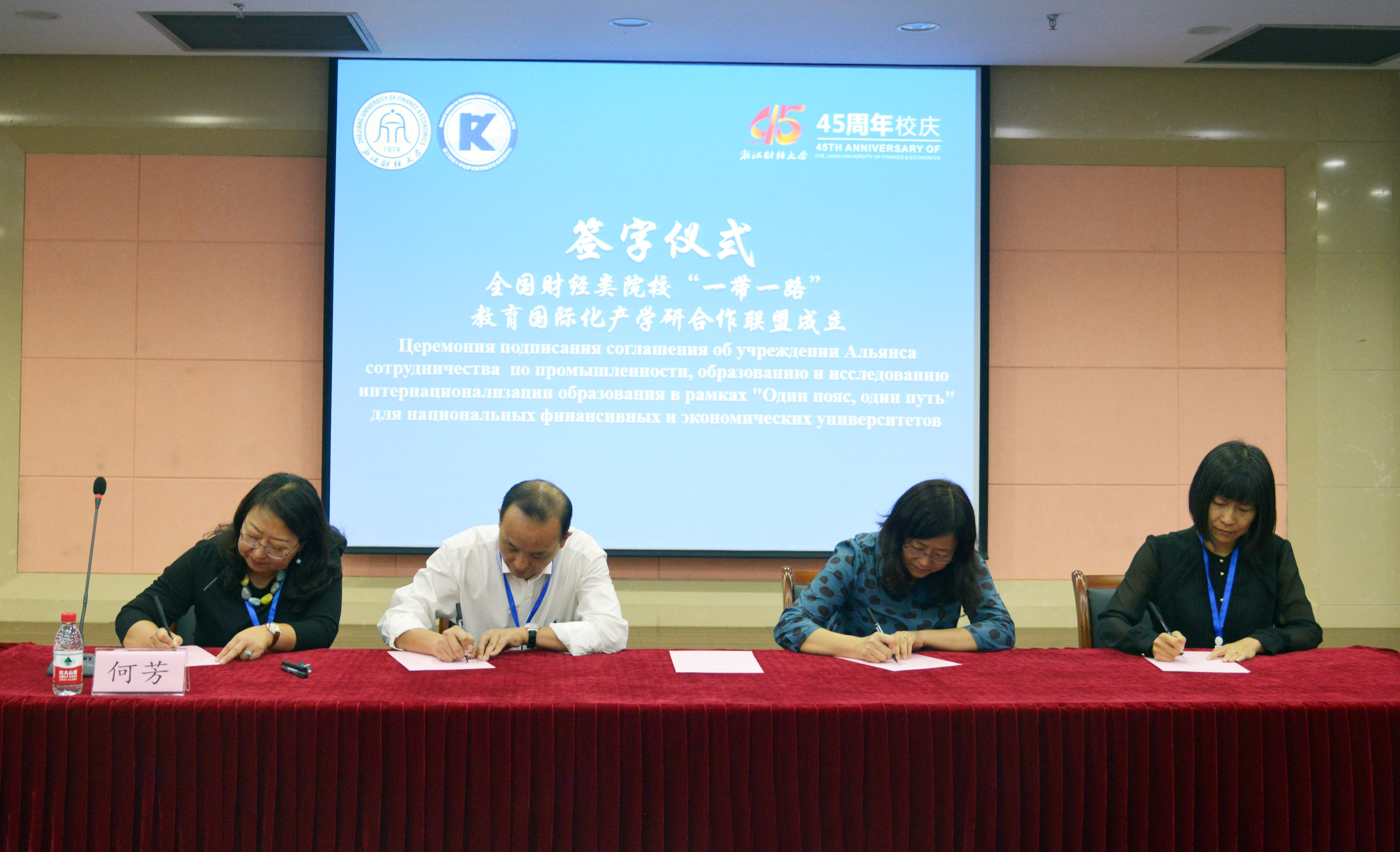 19日下午的论坛,浙江国贸云商控股有限公司濮志江董事长和新疆三宝集团公司段新兰总经理、分别就跨境电子商务对“一带一路”的推进以及中哈经贸实践分享了自己的体会。宁波宁特国际教育科技有限公司董事长陈建平介绍了先进的留学生上课考勤系统。北京唐风汉语教育科技有限公司总裁李劲松介绍了公司的基本业务情况。南京双日公司王靓总经理就留学生招生工作向与会代表进行了详细介绍。其间,还举行了全国财经院校“一带一路”教育国际化产学研合作联盟共同倡议书的签字仪式。签字仪式后,全体与会嘉宾分别就留学生管理、留学生教育提质增效等方面展开了热烈讨论,大家畅所欲言,气氛热烈。