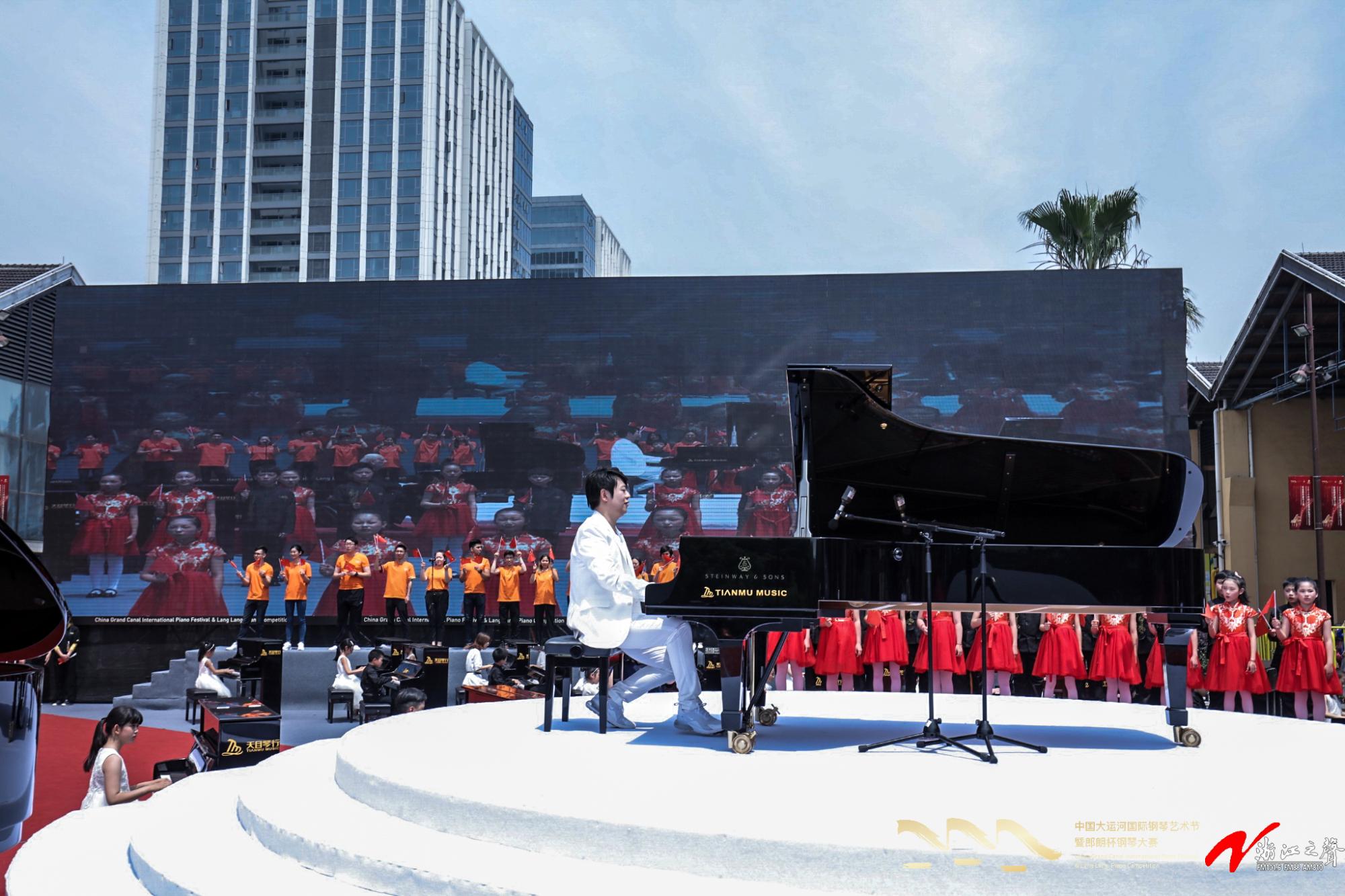 开幕式启动后,郎朗携4位国际钢琴大师会同65名钢琴爱好者,共同演奏《我爱你中国》;402永利集团合唱团及我校留学生、杭州文渊小学合唱团学生与现场观众一起唱响《我爱你中国》,把开幕式活动推向高潮。一时间,《我爱你中国》钢琴曲和歌声飘扬在浙江的大运河沿线上空,表达着对祖国的无比热爱和自豪,向新中国成立70周年献礼!