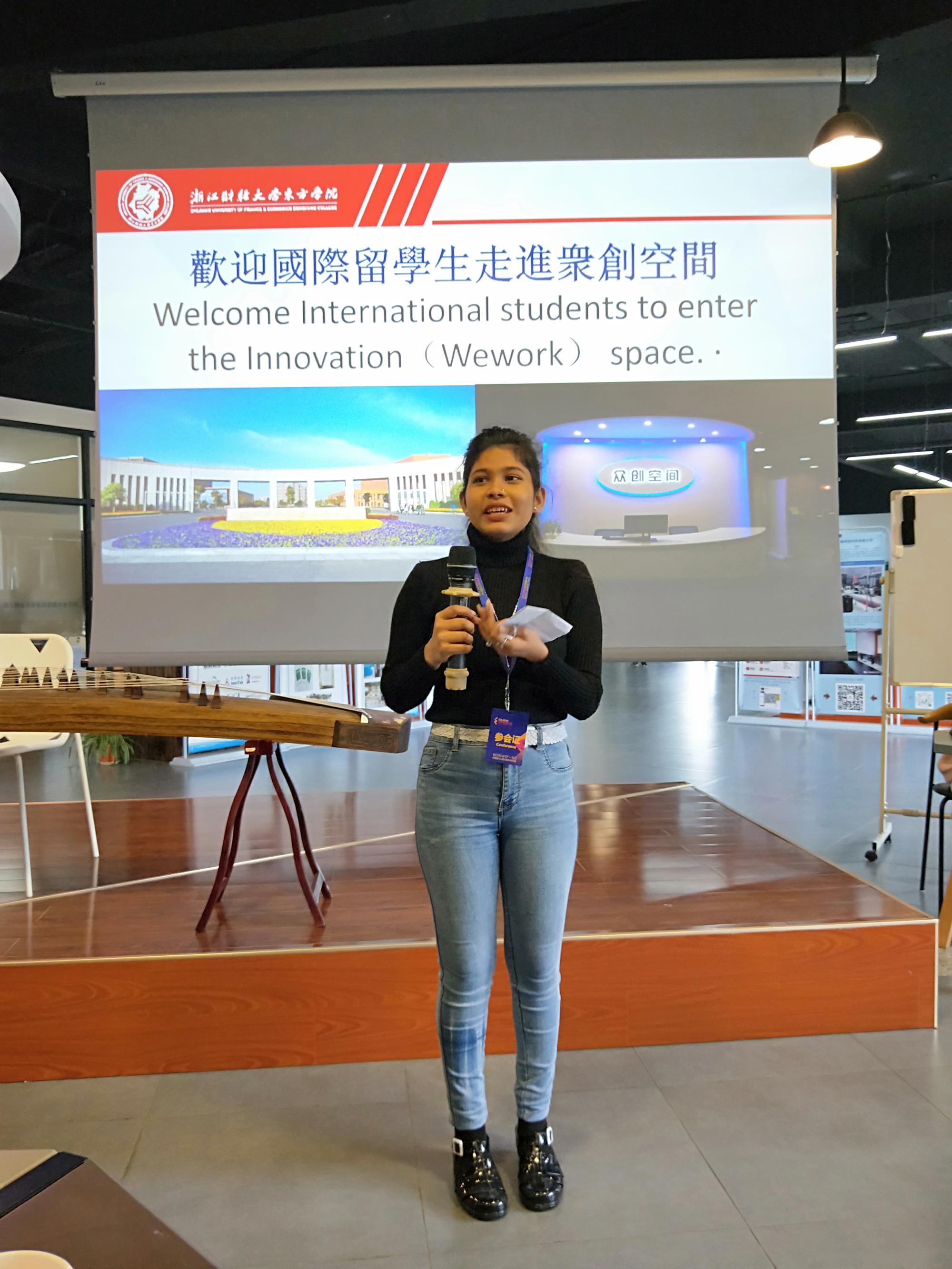 中外学生首先在众创咖啡厅举行了联欢活动,中国学生带来的古筝名曲《渔舟唱晚》,空灵婉转;哈萨克斯坦留学生ZIYADA带来的小提琴独奏《天空之城》,更是引起了大家的共鸣;随后,中国学生一曲《突然想起你》,赢得了阵阵掌声;接着,卢旺达学生朱丽用中文朗诵了一首《你是人间的四月天》,语言流利、情感饱满,讴歌了美好的春天;然后,印度学生ISHITA也用印地语朗诵了一首古老的印度诗歌;最后,中外学生一起共跳“小苹果”、“海草舞”,将活动的氛围推向了高潮。