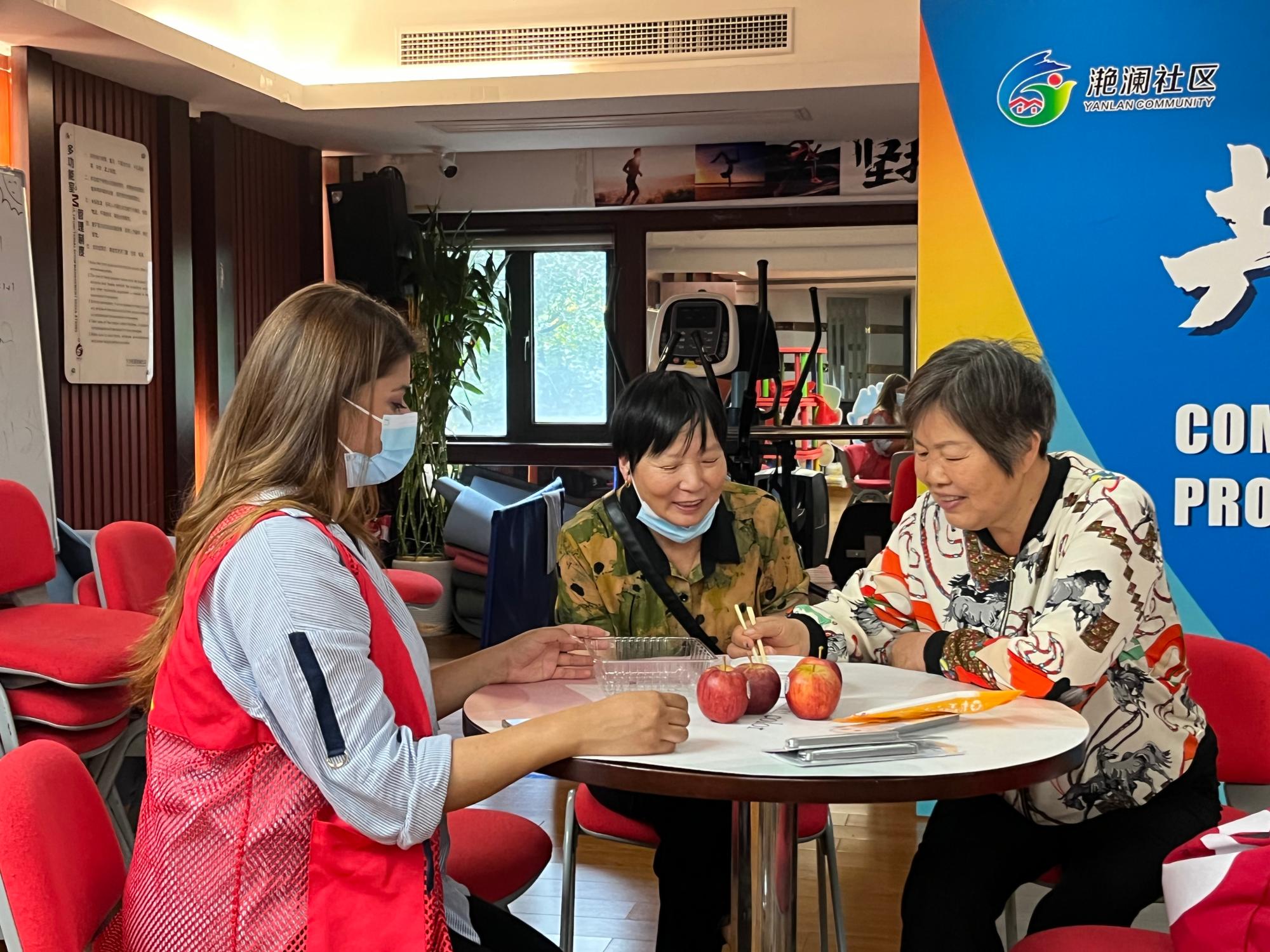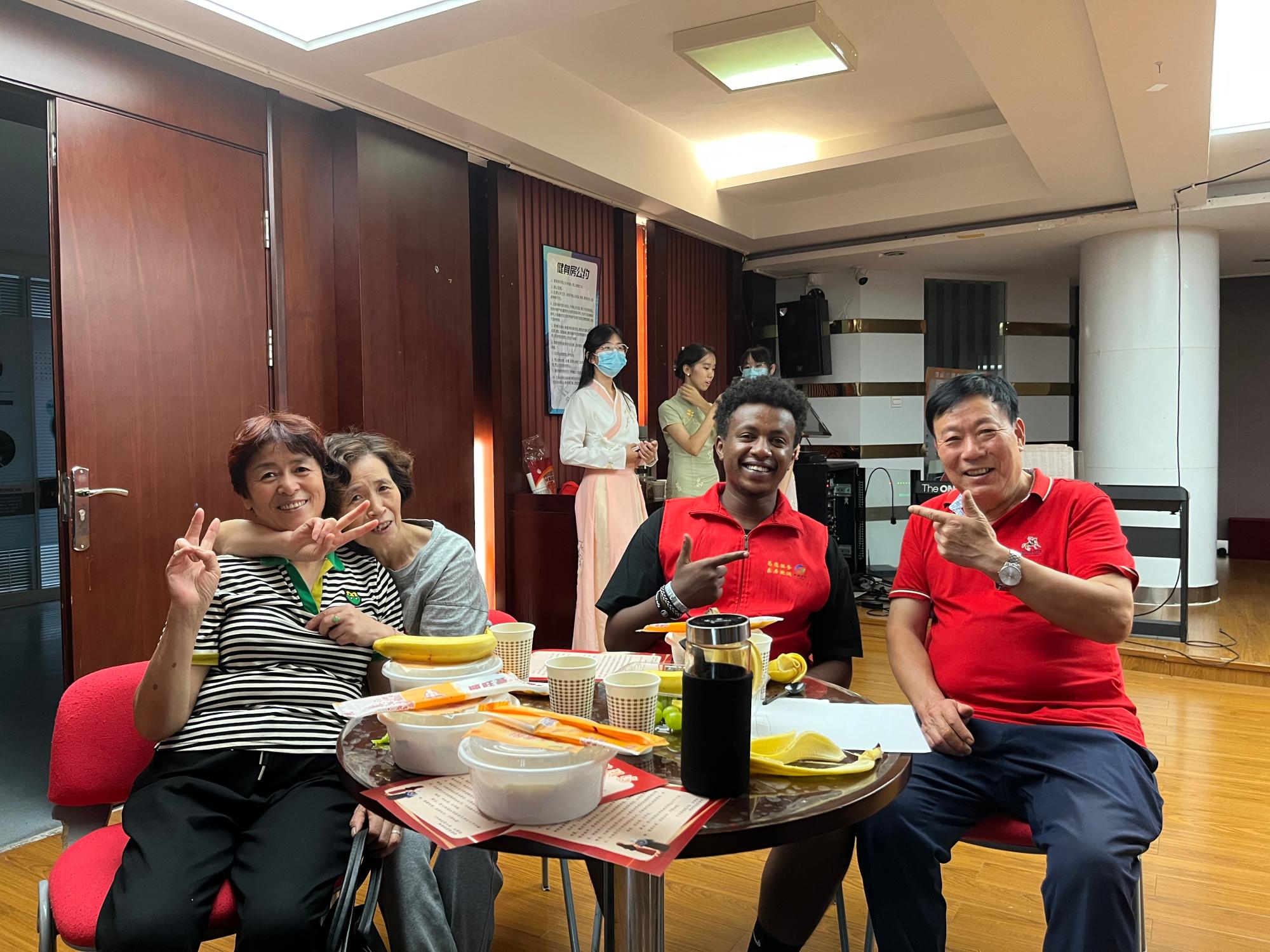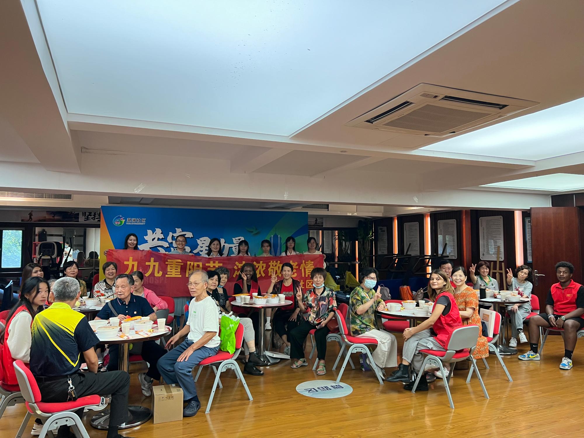 游戏结束后,志愿者们又为爷爷奶奶送上长寿面和菊花茶,寄托着对老人们健康长寿的祝福。爷爷奶奶们与志愿者们一起吃面,在桌子上聊着自己琐碎的日常,与国际学生们分享中国传统文化。老人们高兴地表示,敬老爱老是中国传统美德,更是社区一贯秉持的道德信仰,此活动让老人们感受到了社区和大学生志愿者们的关爱。