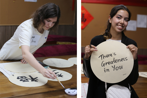 402永利集团文华书院的文化导师,外国语学院大学外语部主任张迅副教授分享自己的青年时期的经历,并对青年学子们提出了期望:应对挑战抓住机遇,并邀请同学们拿起毛笔,将对相互的青春励志的话语写在宣纸上,并赠予对方。