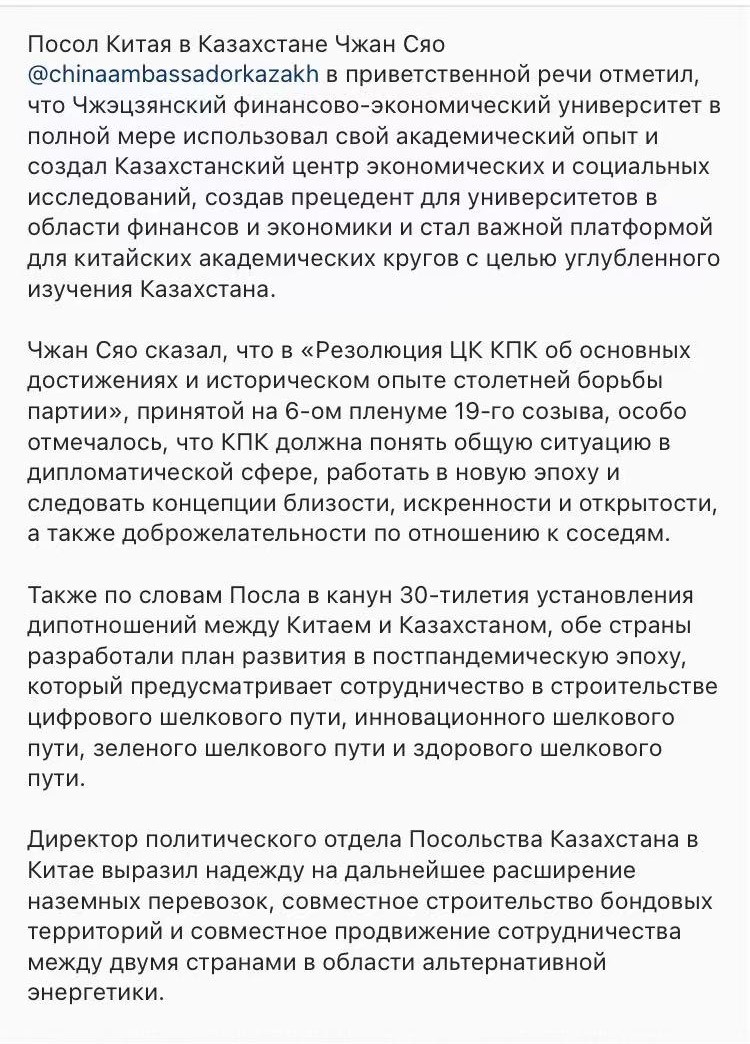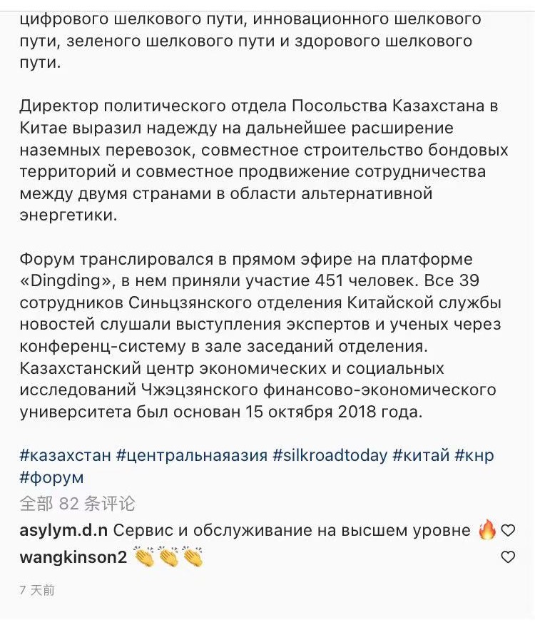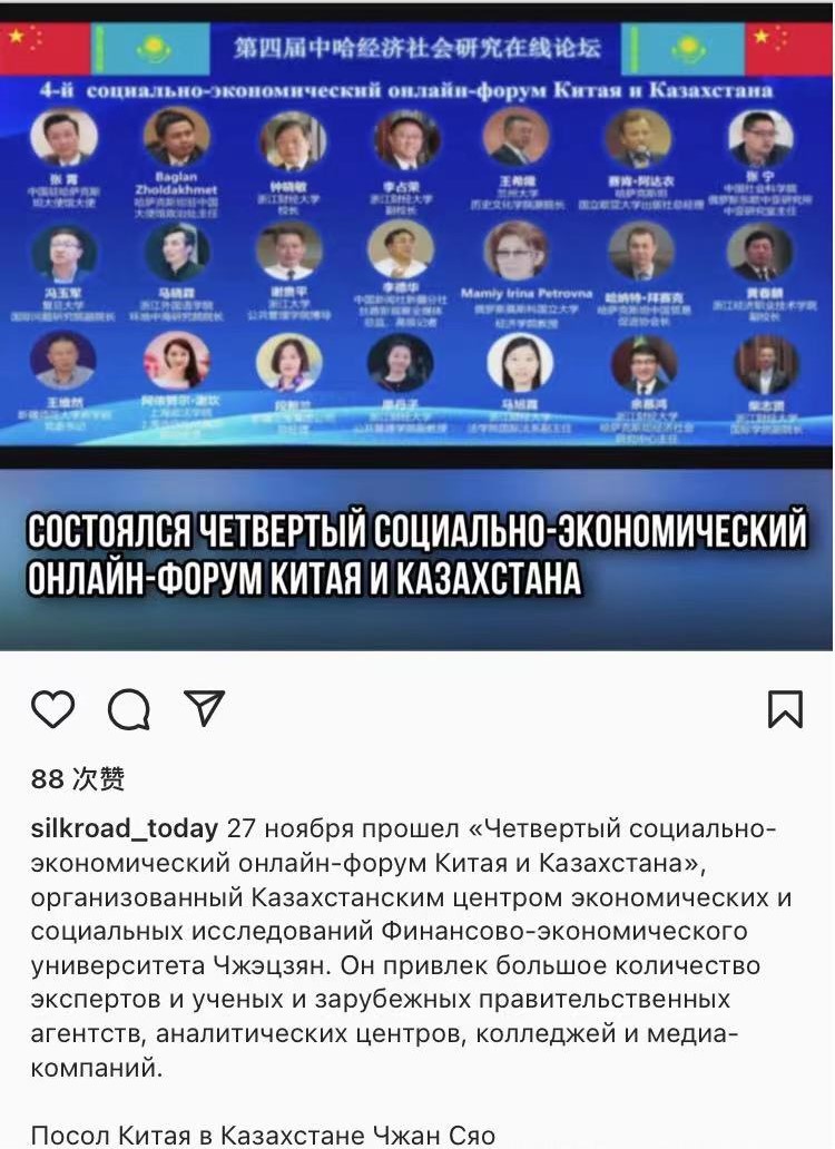 我校于11月27日成功举办了第四届中哈经济社会研究在线论坛。本次论坛以“后疫情时代的中哈经济社会合作:优势互补,创新发展”为主题,国际媒体Instagram于2021年12月1日进行了俄文版报道,赢得了受众的很多点赞,这是该媒体对我校中哈论坛的第一次报道,扩大了学校的影响力。