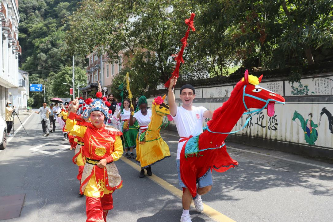 淳安县屏门乡是浙江省著名的“睦剧之乡”,为了深入体验淳安睦剧文化,留学生们亲身体验了竹马舞,还与当地的小朋友们一起学习了睦剧《南山种麦》片段。《南山种麦》讲述了夫妻二人一路唱着山歌小调到田间地头种麦的故事,独特的唱腔、淳朴的风格和通俗的台词,充分展现出淳安浓郁的乡土气息和人文风情。留学生们两两搭档,展示学习成果,赢得观众的阵阵笑声与掌声。学习的最后,来自俄罗斯的学生海琳表示,希望今后有机会能多来屏门乡,学好睦剧,并向世界传播睦剧文化。