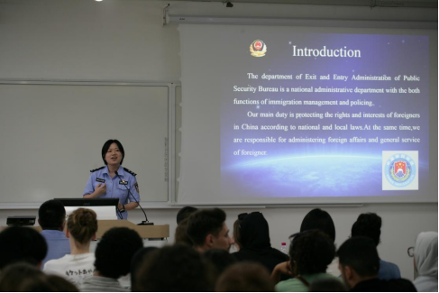 钱塘区公安分局出入境管理大队陈雨琦警官主要讲解了国际学生在华学习生活相关的出入境管理方面的法律法规,提醒学生相关证照更新的细节和注意事项,以及国际学生在华勤工助学,实习就业的规定和办理流程。此外,还重点强调了几种常见的违反出入境法律法规的相关情况,提醒国际学生们要注意避免“三非”问题,为自己在华学习生活提供一个良好的环境。