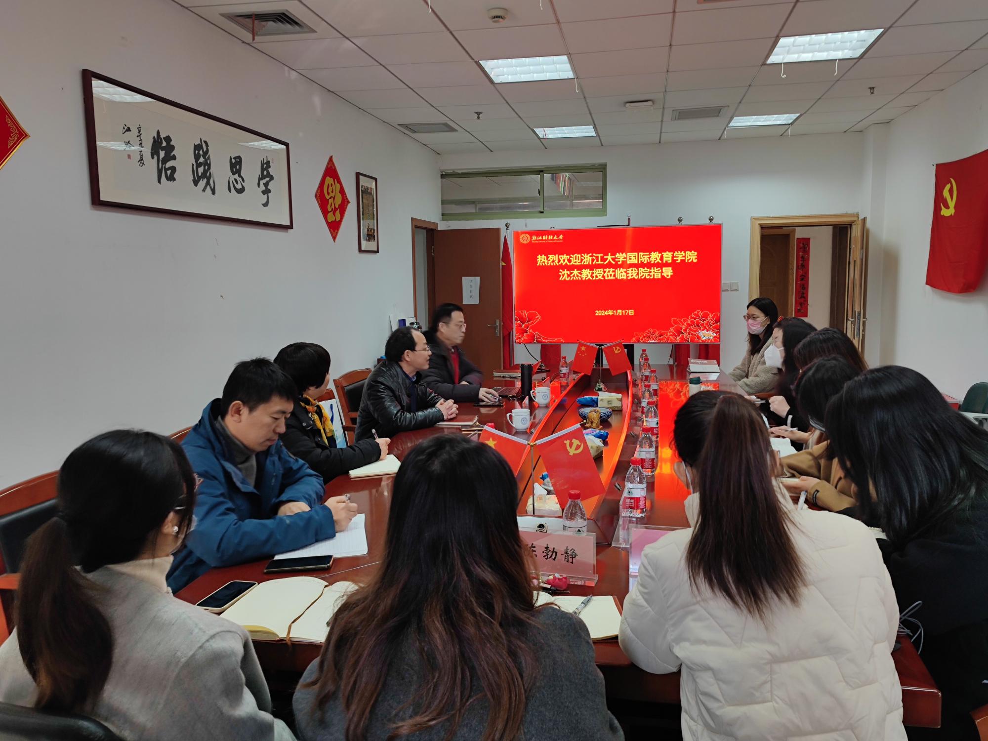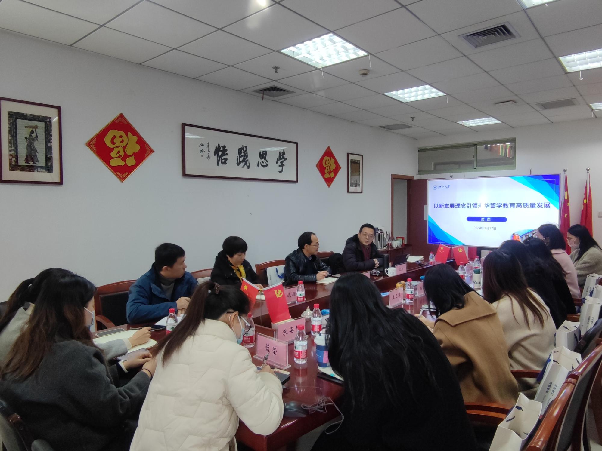 1月17日上午,浙江大学国际教育学院沈杰教授来我院指导交流。沈杰作了《以新发展理念引领来华留学教育高质量发展》的专题讲座。讲座环节由402cc永利院长柴志贤主持,402cc永利全体行政老师、相关学院的留学生本科和研究生教学秘书聆听了此次讲座。