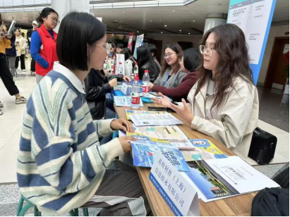 针对外语类学生留学的需求,招聘会现场还设置了“留学直通车”专区,学生可以根据留学意向分别参加英国、澳大利亚、新西兰、日本、新加坡等分会场的咨询,院校代表和项目负责人就各国的留学政策、合作院校的录取条件等方面进行详细咨询,现场气氛热烈。