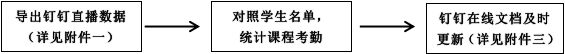 1.直播模式授课的老师:可通过电脑版钉钉,导出直播数据和回放观看数据。根据后台数据,对照学生名单统计考勤,并在课程考勤名单(钉钉在线文档)中及时更新。