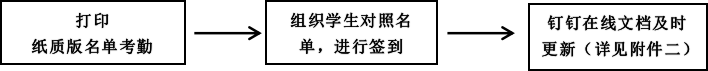 2.利用纸质版名单考勤的老师:可根据纸质版名单原始考勤记录,对照学生名单统计考勤,并在课程考勤名单(钉钉在线文档)中及时更新。