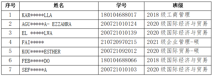 It has been verified that the following 7 international students went to other cities or provinces without approval during the epidemic prevention and control period, concealed and delayed reporting their location, which violated the COVID-19 epidemic prevention and control requirements of Zhejiang University of Finance and Economics and the COVID-19 epidemic prevention and control regulations of School of International Education and Studies during the epidemic prevention and control period. In order to strictly enforce the school discipline and educate all students, the school decided to give these seven students Serious Warning and disqualify them for this academic year's scholarship evaluation.