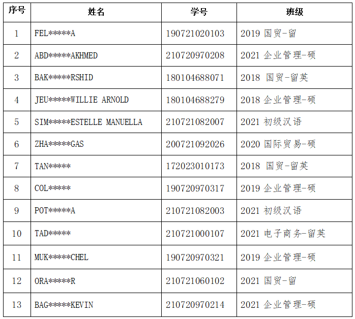 Another 13 international students, during the epidemic prevention and control period, left Hangzhou without approval and failed to implement the daily health check-in system as required, which violated COVID-19 epidemic prevention and control requirements of Zhejiang University of Finance and Economics and the COVID-19 epidemic prevention and control regulations of School of International Education and Studies. In order to strictly enforce school discipline and educate all students, the school decided to give these 13 students Warning.