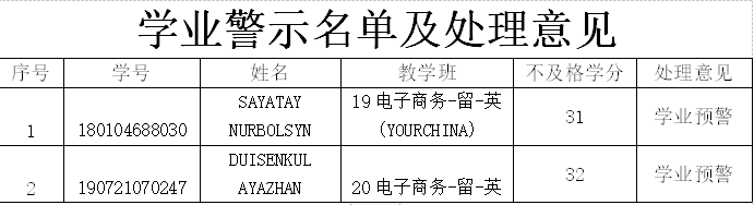 为加强来华国际学生学习过程管理,确保国际学生教学和人才培养质量,引导学生在规定时间内完成学业,402cc永利会同信息管理与人工智能学院对2020-2021学年第二学期及以往累计学期的学生学业完成情况进行了审核。经核查,SAYATAY NURBOLSYN等两名学生各学期累计需重修课程(不包含重修合格课程)达24学分(含)以上。根据《402永利集团国际学生学籍管理规定》第三十八条规定,学院决定向SAYATAY NURBOLSYN等两名学生提出学业预警。
