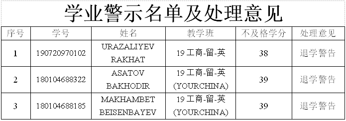 为加强来华国际学生学习过程管理,确保国际学生教学和人才培养质量,引导学生在规定时间内完成学业,402cc永利会同工商管理学院对2020-2021学年第二学期及以往累计学期的学生学业完成情况进行了审核。经核查,URAZALIYEV RAKHAT等三名学生各学期累计需重修课程(不包含重修合格课程)达36学分(含)以上。根据《402永利集团国际学生学籍管理规定》第三十八条规定,学院决定向URAZALIYEV RAKHAT等三名学生提出退学警告。